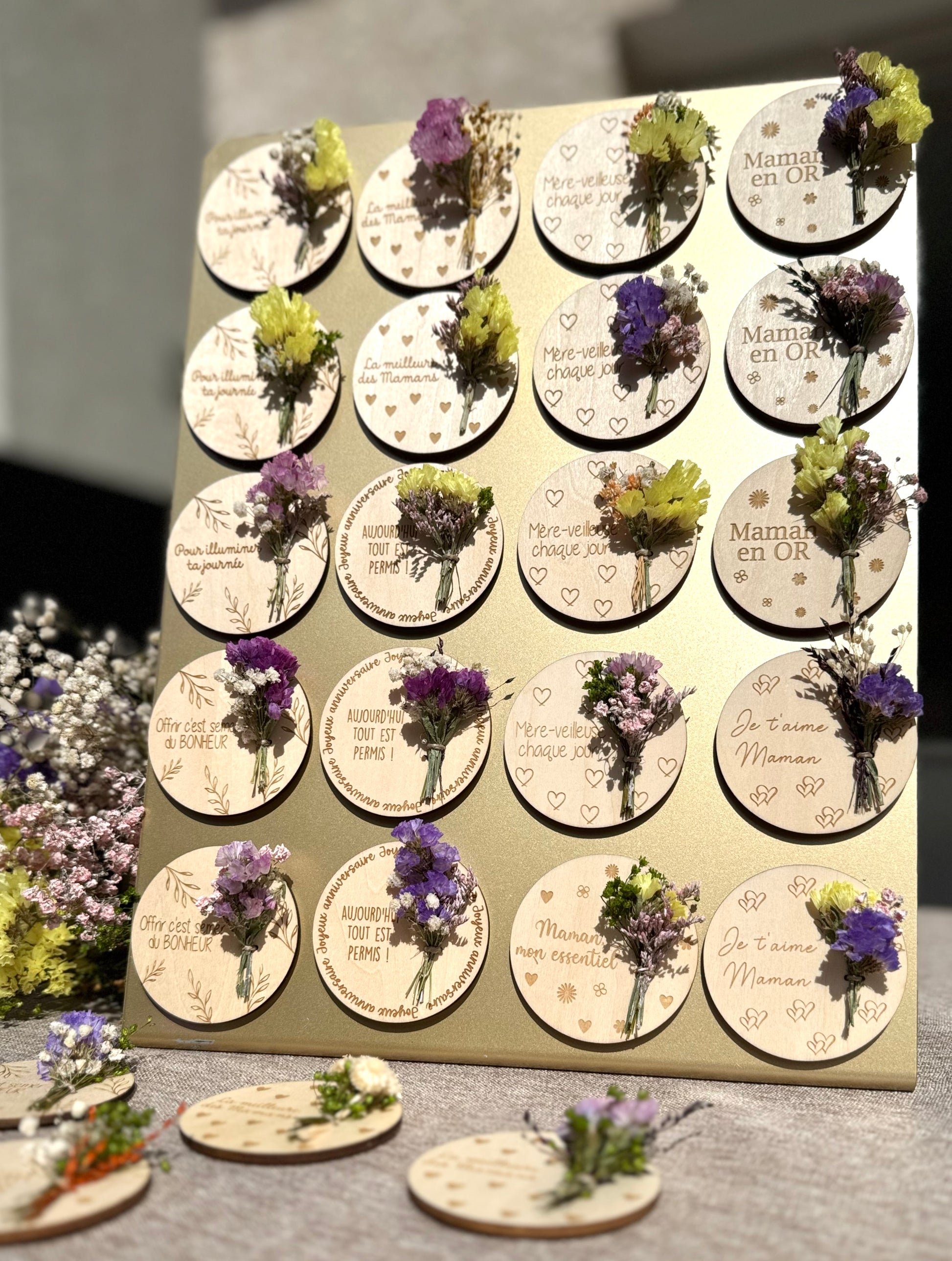 Les fleurs sont choisies par mes soins, en fonction des saisons et de l'inspiration du moment, ce qui rend chaque magnet encore plus spécial. Les couleurs peuvent donc varier d'un modèle à l'autre.